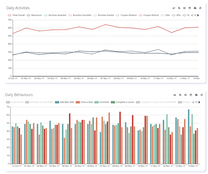 Activity streams help to surface information allowing users to keep up with what is going on. All the behaviours being done and the rewards being earned are shown. You can then apply the power of filters to segment your activity streams.